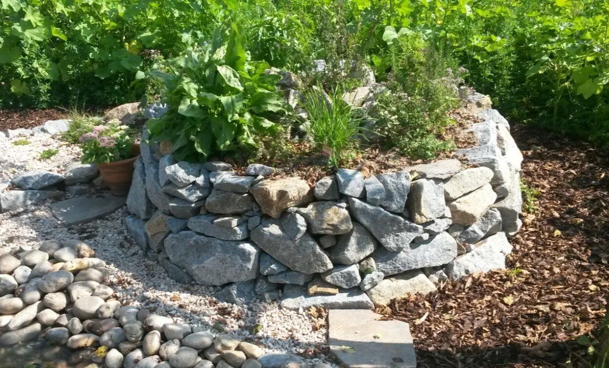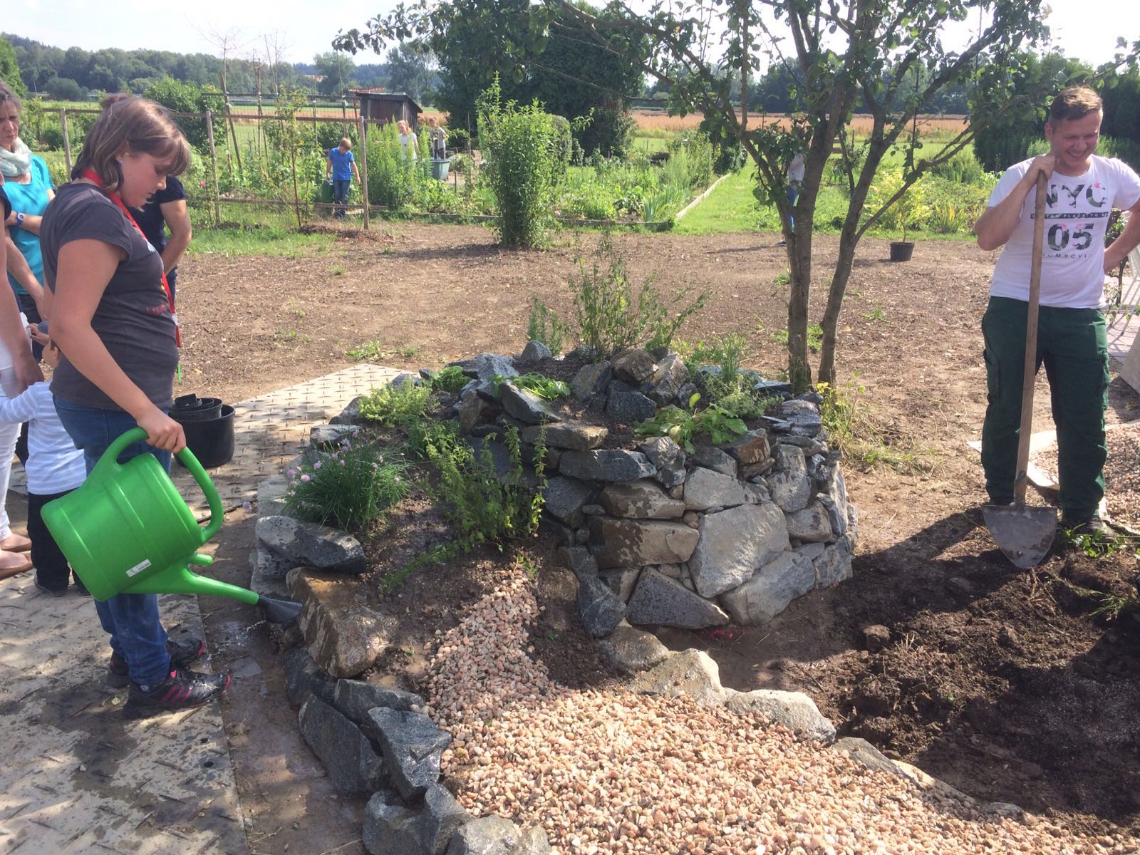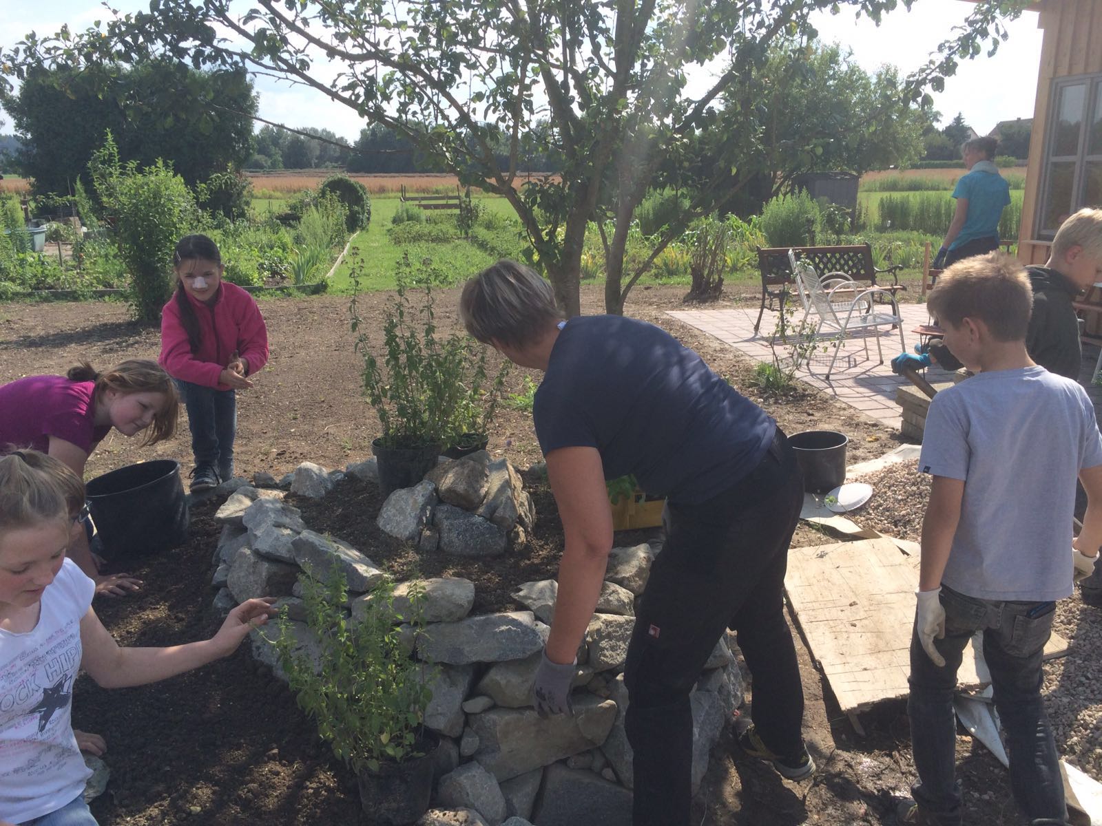 Zusammen mit den Erwachsenen errichteten die Gartenwichtel eine Kräuterschnecke. Gemeinsam schleppten sie Steine, richteten diese zu einer Schnecke auf, schaufelten Erde hinein und pflanzten schließlich viele verschiedene Kräuter. Und nach getaner Arbeit durfte natürlich eine Brotzeit auch nicht fehlen!